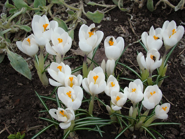 У меня пока только желтенькие крокусы цветут вовсю... вновь посаженные белые (сорт Жанна Д'Арк) пока набирают силу - бутончики есть, но еще не распустились...