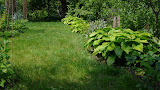 Из дворика выходим на лужайку, которая обардюрена хостами.