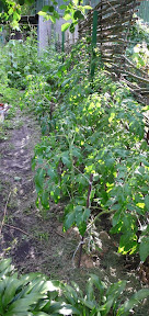 Здесь помидоры в два ряда: высокие - к забору, низкие (Кибиц) - к дорожке.