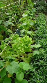 под забором обортованая планкой растет фасоль, под бортом в канавке набитой компостом - огурцы, перед огурцами - низкая астра держит борт :)