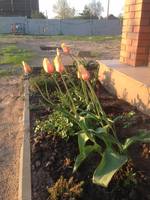 Хочу показать тюльпанчик,который меня привёл ну просто в дикий восторг- "Blushing Lady" . Идеально в нём всё-красивые высокие стебли до 80 см. в длину,изящная лилиевидная форма,необычайно нежное сочетание персиковых,сливочных,нежно-розовых тонов и восхитительный яркий штрих от середины цветка. Особенно впечатлил размер цветка,он реально огромен,в раза два больше стандартных сортов. На полуденном солнце цветок раскрывается полностью,превращаясь в блюдечко. Цветёт этот тюльпан уже три недели,ни солнце,ни дождь ему ни по чём. Вот такая моя новая любовь,осенью приму таблетку от жадности и куплю обязательно ещё луковичек.