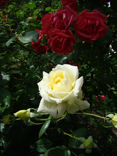 Мой Эльф (это было его второе лето) посажен возле корнесобственной простенькой розочки, последняя превратилась в слоника. Им тесно, Эльф явно страдает. А выглядит это так: ![]() Вообще-то мне нравится, но розам тесно - надо менять. Фотка темная - это там такая тень от красной розы. ![]() Есть сонечное место у забора, здорово подойдет для розы. Вдоль забора планируется шпалера с синим клематисом, и на его фоне роза-куст. Ещё одна шпалера там, в моем представлении, - это перегрузка. А спрашиваю потому, что не получается у меня держать клаймбер кустом. Хоть в сети есть информация, что вопрос только в обрезке. По весне обрезаю - вроде куст, а во второй половине лета растут длинющие побеги от корня (особенно в этом году, от жары что-ли?) - была б шпалера, пришпилила и делов-то, а куст теряет всякую форму. Может, надо просто подождать пока роза повзрослеет, и тогда это будет похоже на фонтан? Но пока увы... Значит, буду искать место под шпалеру с Эльфом.
